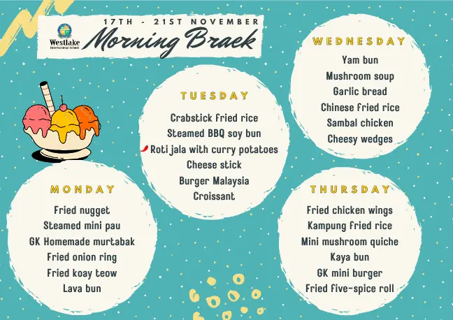 The WIS cafeteria is run by Grand Kampar Hotel using Vircle cashless system. We strive to create interesting menus to suit different palates, bearing in mind the importance of nutritional values that must accompany it. During special seasons like the Raya and Deepavali festivals, special menus are created in commemoration of these events. Being an establishment that seeks to constantly grow and learn, we welcome feedback and suggestions in order to serve our customers better.
